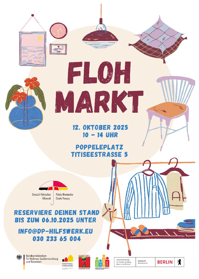 Am Sonntag, 12. Oktober, gibt es im Kiez einen Kinder- und Familienflohmarkt. Und zwar auf dem Poppeleplatz, Titiseestraße 5. Organisiert wird er vom Deutsch-Polnischen Hilfswerk e.V.