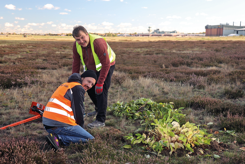 Der kleine Pappelsprössling sieht so zerbrechlich und unscheinbar aus, und doch halten sich seine Wurzeln hartnäckig im Boden. Während die Kraniche in großen Gruppen und mit lautem Trompeten hoch oben über die offene Fläche des ehemaligen Flugplatzes TXL in Richtung Süden ziehen, leisten rund 20 Freiwillige eine schweißtreibende Arbeit auf den Grünflächen zwischen den Rollfeldern. Sie benötigen nicht nur den Spaten, sondern auch ihre ganze Körperkraft, um das meterlange dünne Pflan-