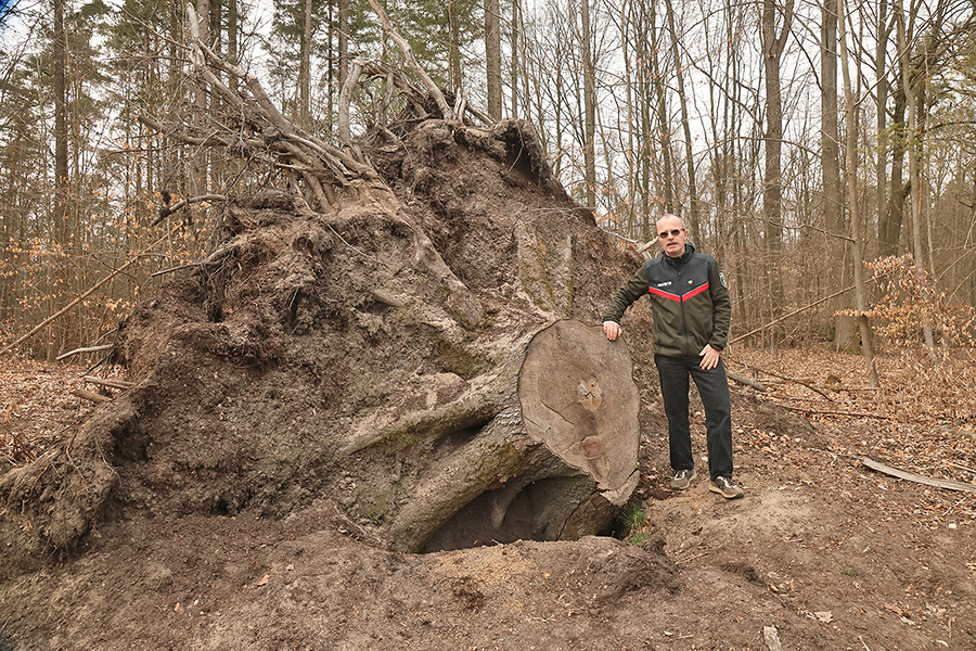 „Nach dem Sturm haben wir uns erst durch den Einsatz von Drohnen einen Eindruck vom Ausmaß der Schäden verschaffen können“, sagt Franusch „So haben wir ermittelt, dass in den drei genannten Revieren Bäume mit einer Holzmasse von 40.000 und 50.000 Kubikmeter geworfen oder gebrochen wurden.“ Doch davon haben die Forstarbeiter nicht mehr als 8.000 Kubikmeter herausgeholt und verkauft – also nicht mehr als 20 Prozent.