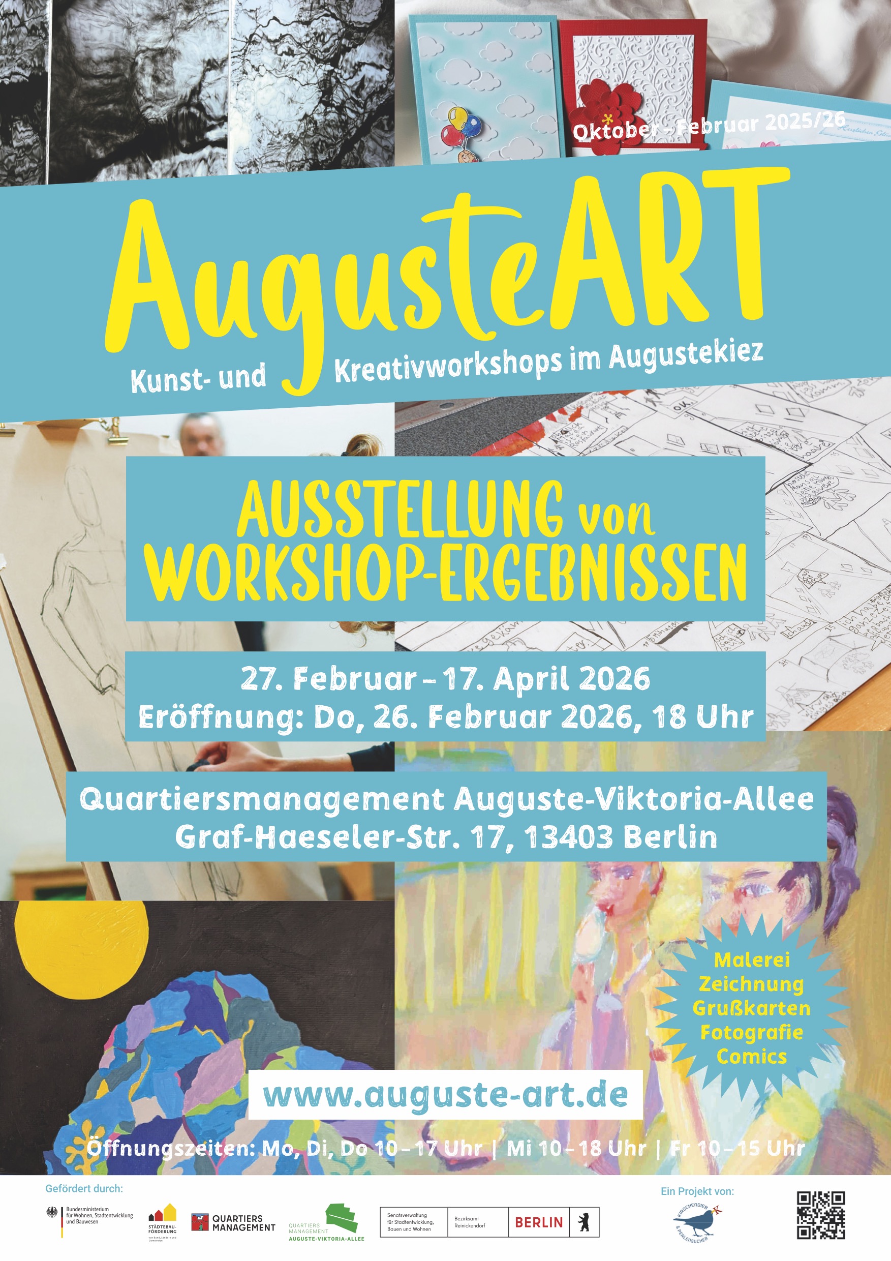 Am Donnerstag, 26. Februar, 18 Uhr, wird im Quartiersbüro, Graf-Haeseler-Straße 17, eine Ausstellung des Projekts „AugusteART“ eröffnet. Teilnehmer aus dem Kiez zeigen ihre Ergebnisse aus Workshops in den Bereichen Malerei, Zeichnung, Comic, Kartengestaltung und Fotografie. Interessierte sind herzlich eingeladen, bei der Eröffnung dabei zu sein. Für Knabbereien und Getränke ist gesorgt.