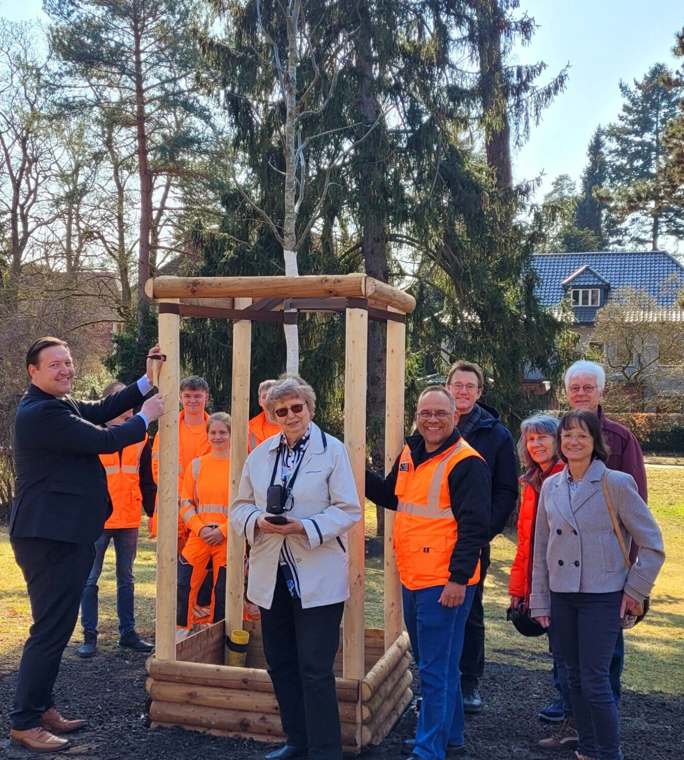 Eine Blutbuche wurde auf dem Donnersmarckplatz in Frohnau gepflanzt. Sie ersetzt die über 100 Jahre alte Buche, die aufgrund eines Pilzbefalls im April 2024 aus Verkehrssicherungsründen gefällt werden musste.