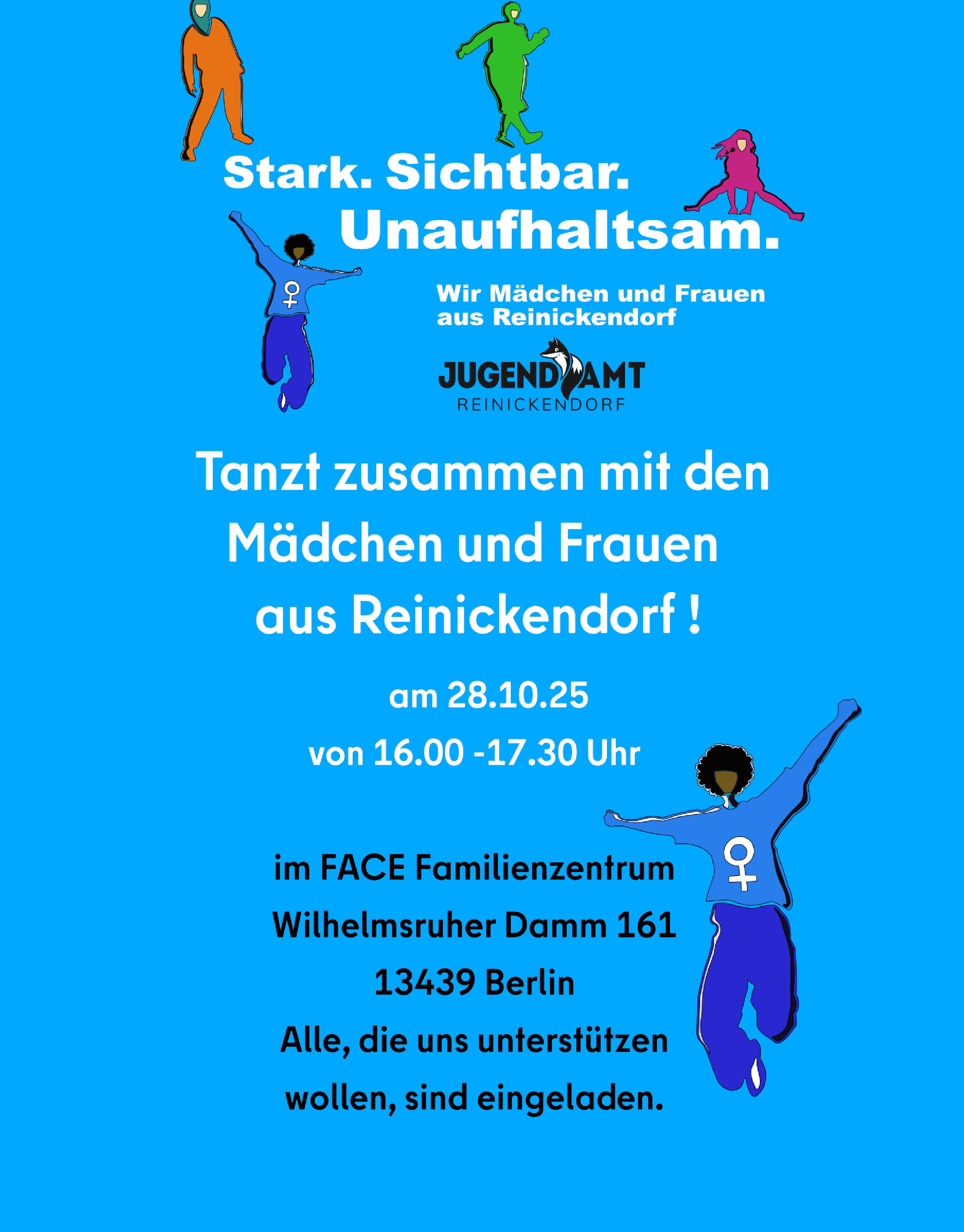 Unter dem Motto „Stark. Sichtbar. Unaufhaltsam. Wir Mädchen und Frauen in Reinickendorf“ findet am Dienstag, den 28.10.2025 eine Mitmach-Tanzaktion des Mädchen- und Frauenarbeitskreises Reinickendorf in Kooperation mit dem Jugendamt statt. Gemeinsam mit Reinickendorfer Mädchen und Frauen, Jugendlichen und Fachkräften aus Jugendfreizeiteinrichtungen findet die Tanz-Aktion zwischen 16 Uhr und 17.30 Uhr im FACE-Familienzentrum am Wilhelmsruher Damm 161 statt. Gäste sind unter anderem die Gleichstellungsbeauftragte des Bezirks Susanne Jörg und Jugendamtsdirektorin Claudia Schütz.