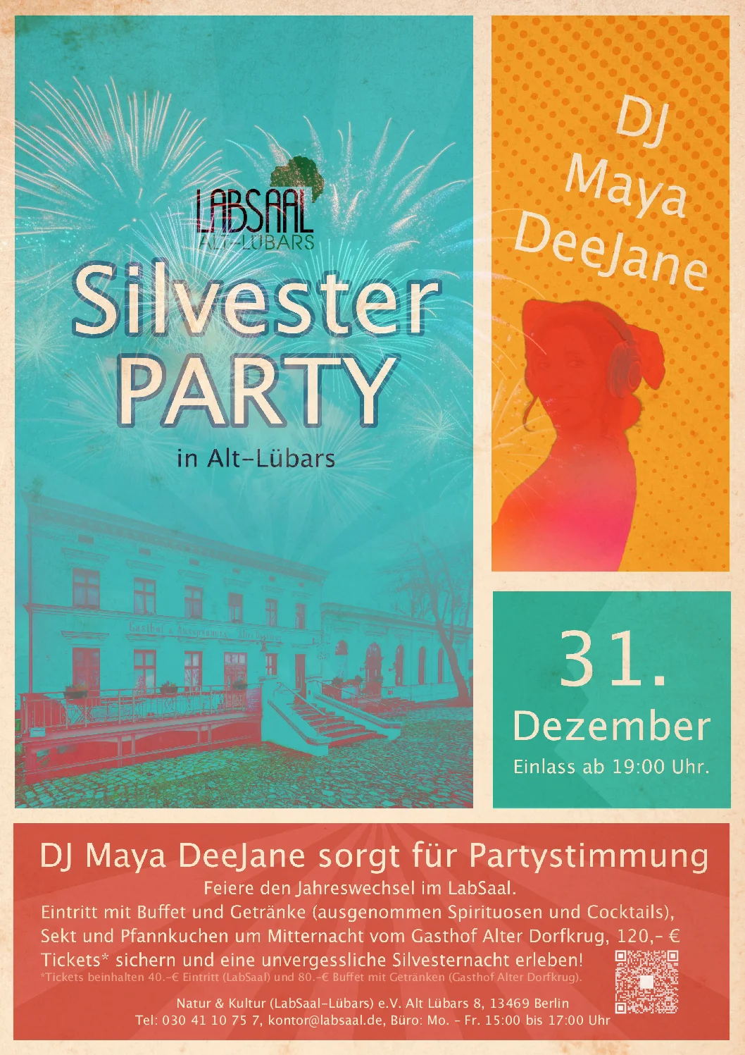 Eine festliche Silvesternacht mit Musik von Maya Deejane wird durch Eintritt, Buffet, Getränke sowie Sekt und Pfannkuchen um Mitternacht abgerundet.