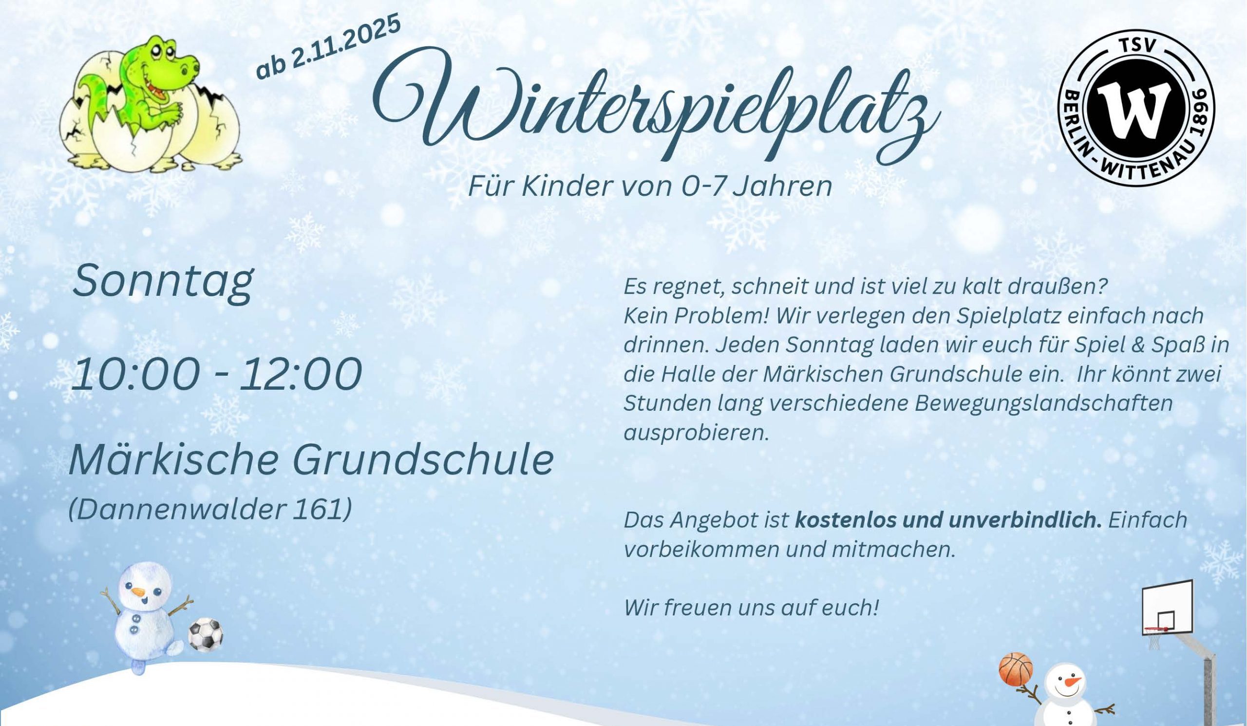 Es regnet, schneit und ist viel zu kalt draußen? Auf dem „Winterspielplatz“ des TSC Wittenau können Familien am Sonntagvormittag 1 bis 2 Stunden trocken und warm und in Bewegung verbringen. Zwischen 10 und 12 Uhr ist die Sporthalle Märkische Grundschule am Dannenwalder Weg 161 für Spiel & Spaß geöffnet. Das Angebot ist kostenlos, jeder, der Lust hat, kann vorbeikommen.